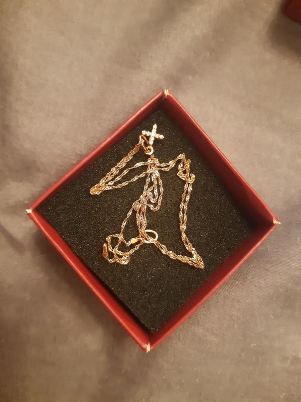 Золото,цепочка 40 см, крестик не к продаже, Замочек не работает, но есть.Беля 1 г.Подаю фото с сайта, где заказила. Без бирки.