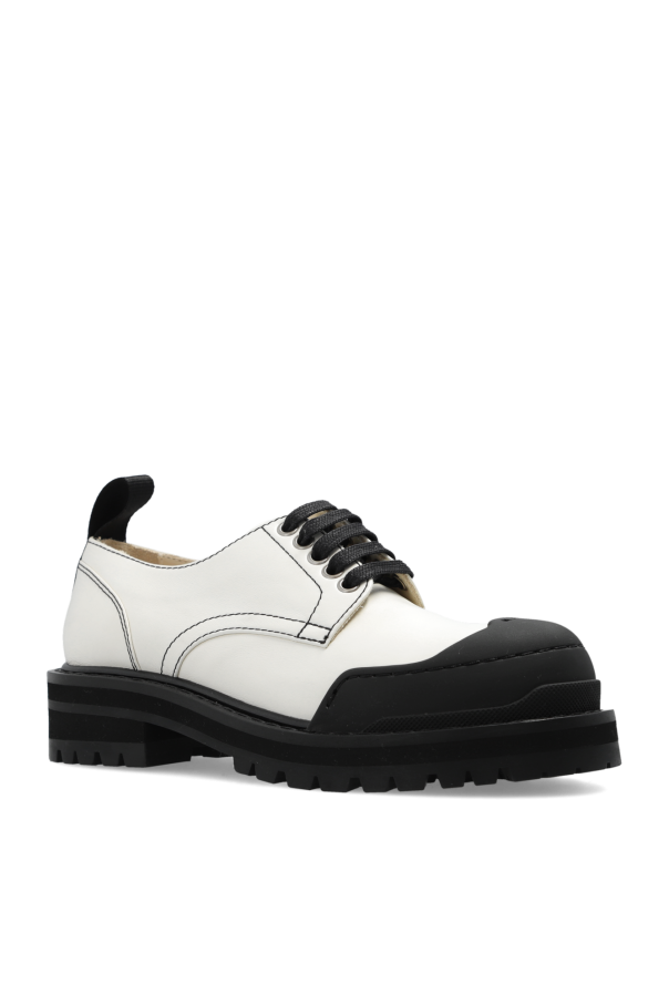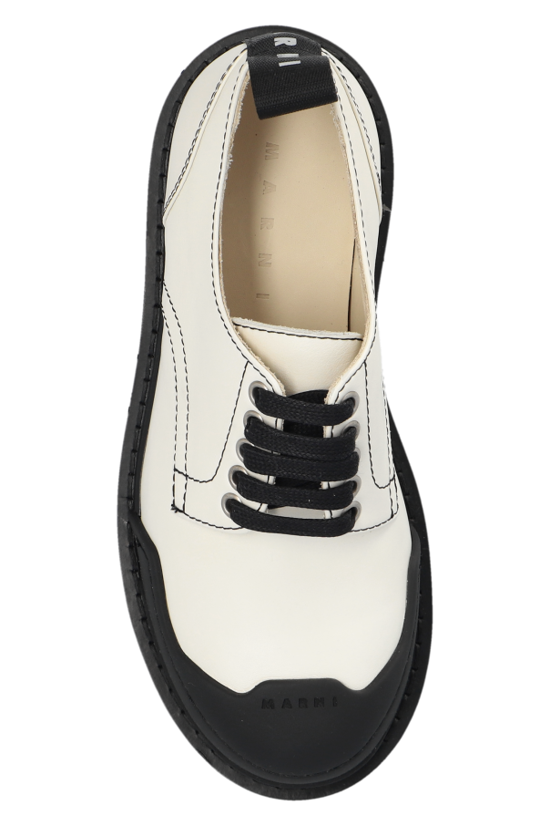 Cream Derby shoes from Marni. Made of leather, this lace-up model sits on a black rubber sole and features an embossed logo, contrasting stitching details and a pull tab with a white logo on the back.