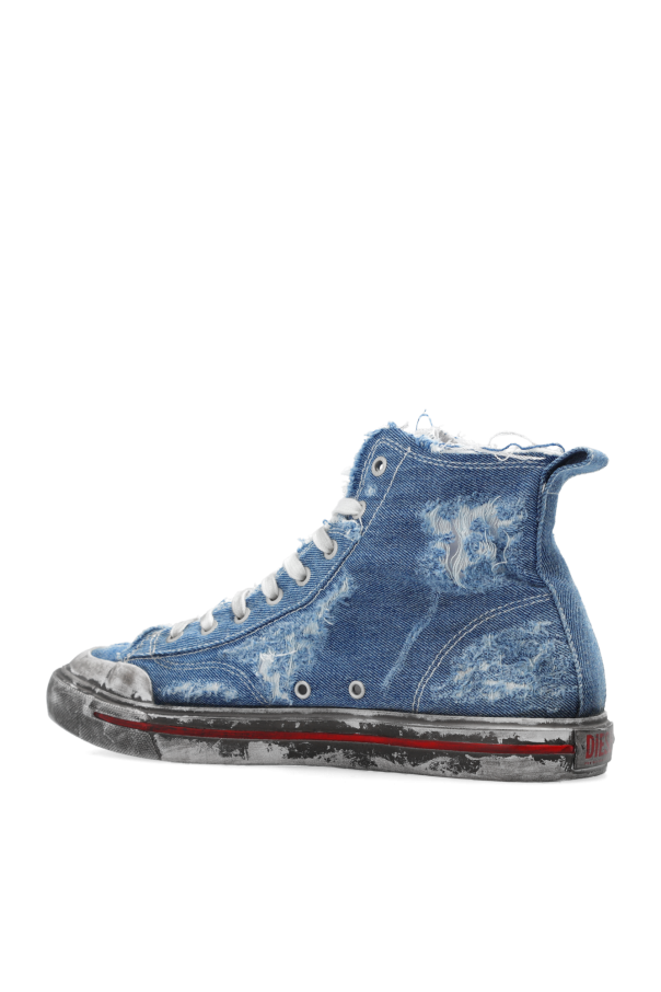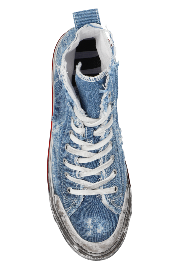Blue ‘S-ATHOS MID’ high-top sneakers from Diesel. Crafted from denim, this lace-up pair features a logo detail on the side, worn effect and grey rubber sole.