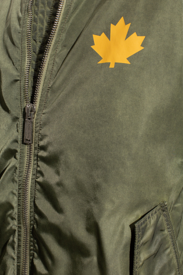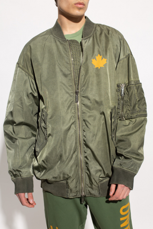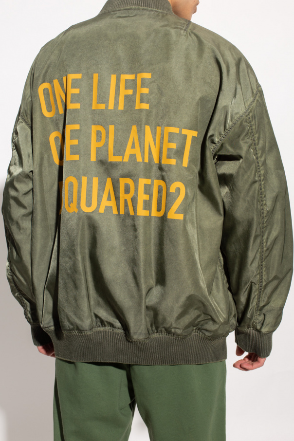 Green bomber jacket from Dsquared2, the ‘One Life One Planet’ collection. Fastened with a two-way zip, this garment features blue logo prints on the front and back, two flap pockets and ribbed trims at the collar, hem and cuffs.