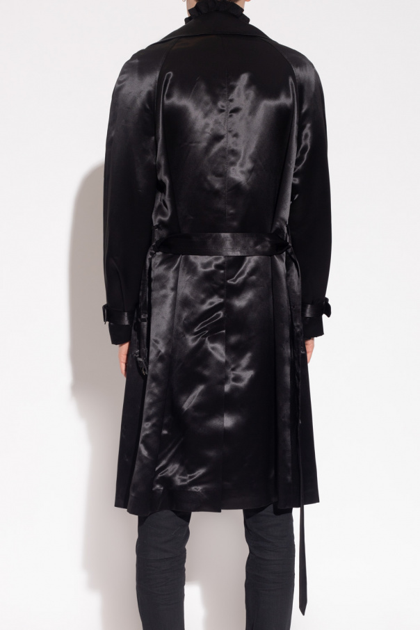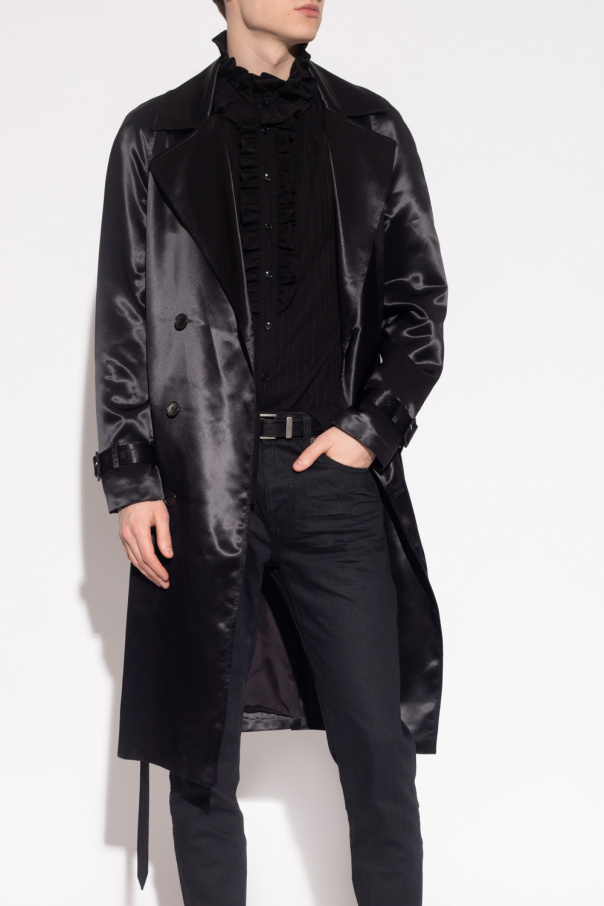 Black coat from Saint Laurent. Crafted from satin with a double-breasted silhouette, this style features button fastenings, notch lapels, a waist-cinching belt, two slip pockets, a single back vent and long sleeves with buckle straps.