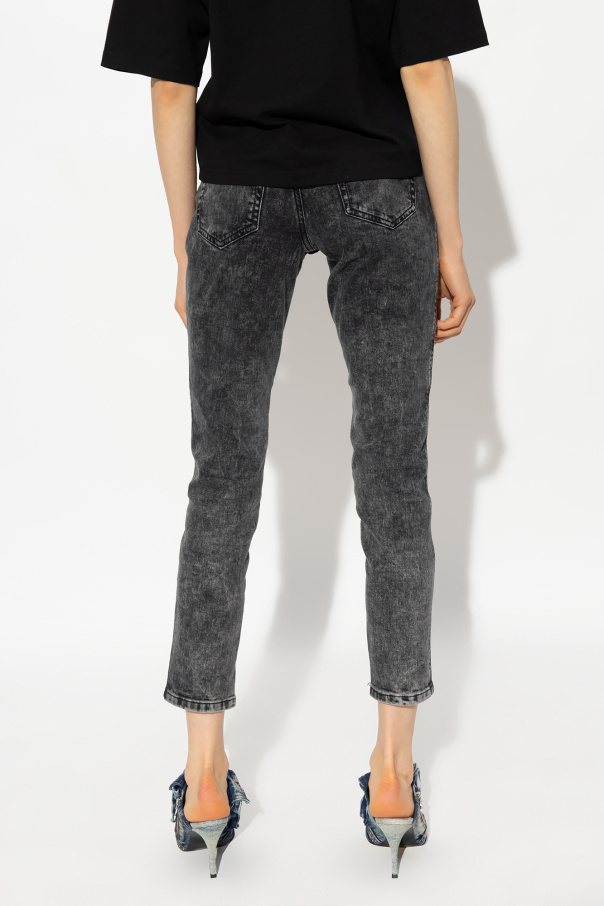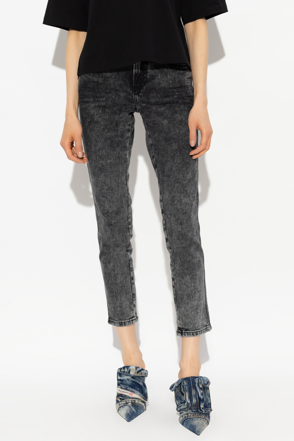 Dark grey ‘2015 BABHILA L.30’ jeans from Diesel. Fastened with a button and zip, this skinny fit pair features logo patches, five slip pockets and vintage effect.