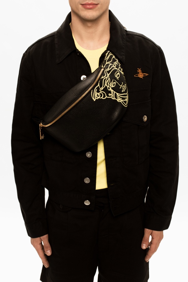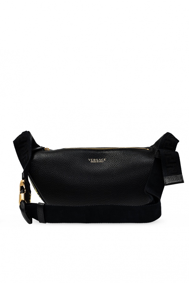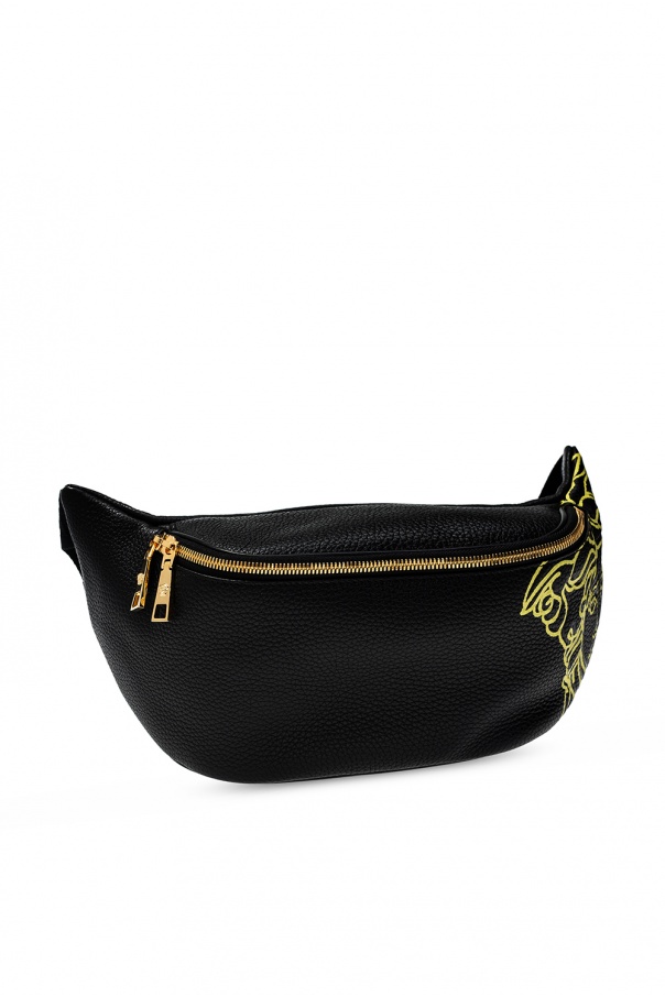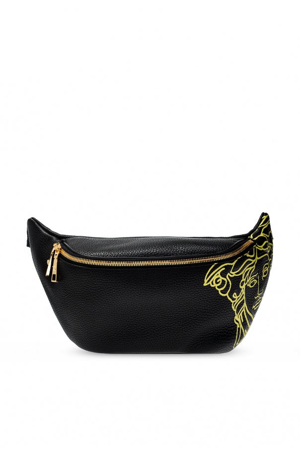 Black belt bag from Versace. Crafted from leather, this item fastens with a double zip and features a yellow Medusa head print, zip pocket and gold-tone logo print at the back, adjustable belt, one internal compartment and gold-tone metal hardware.