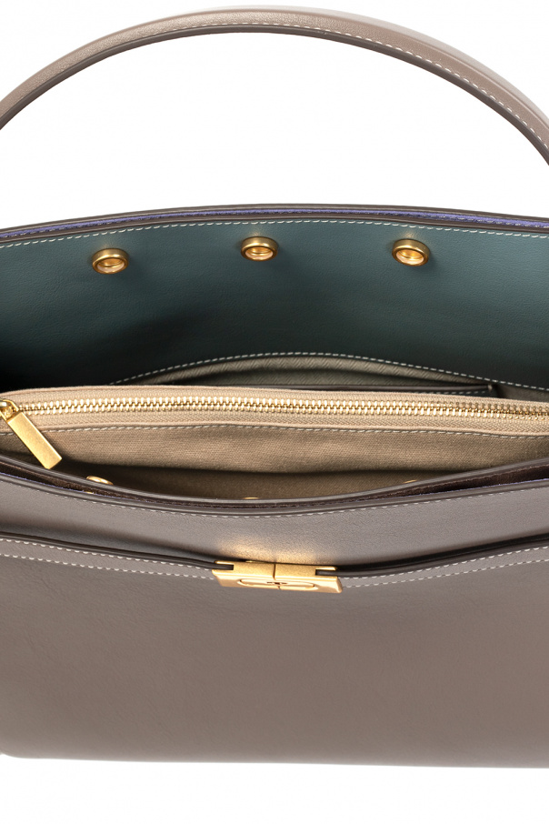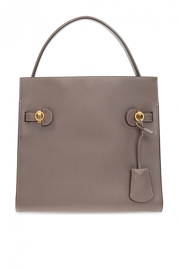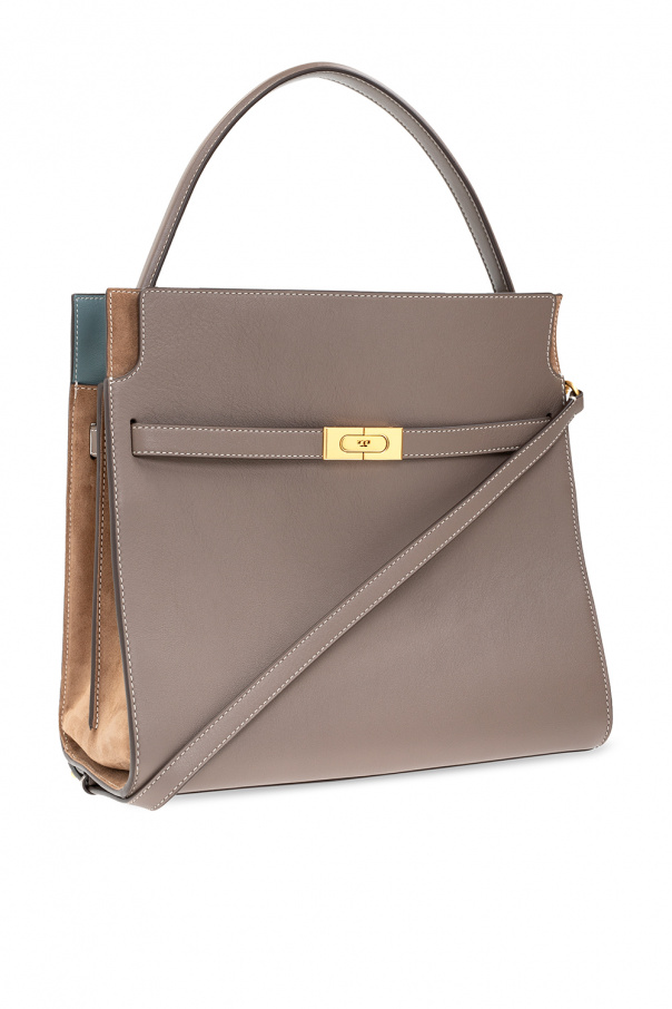 Grey ‘Lee Radziwill’ shoulder bag from Tory Burch. Crafted from leather and suede, this design secures with a decorative logo fastener and features a half-round handle, a detachable and adjustable shoulder strap, gold-tone metal hardware and a grey, beige and blue-clad interior with one compartment and multiple pockets to store all your valuables.