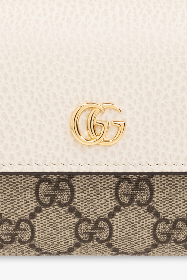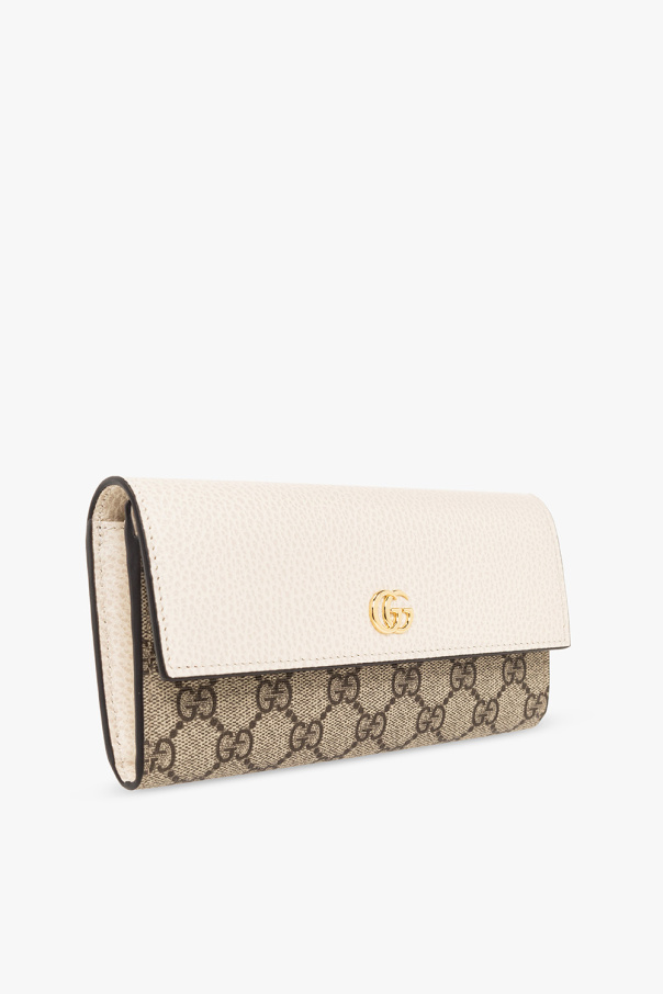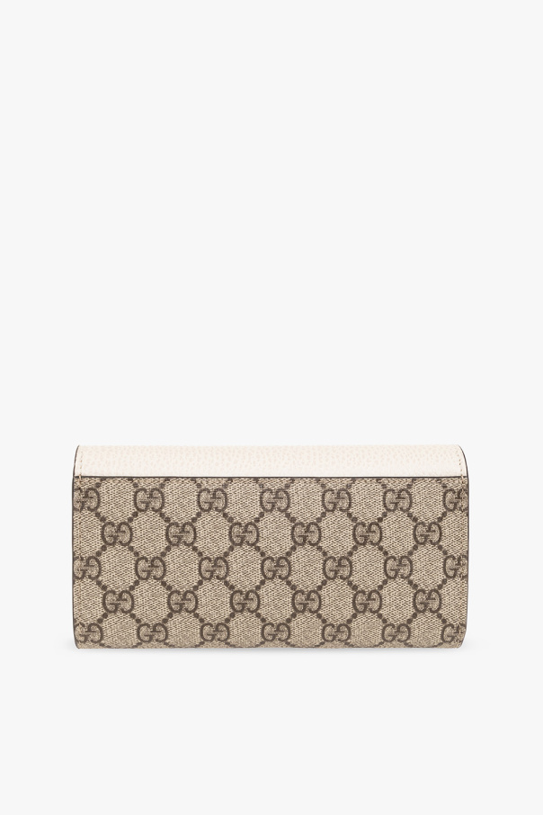 Beige, brown and cream wallet from Gucci. Crafted in ‘GG Supreme’ canvas and trimmed with grained leather, this design features a snap fastening, ‘Double G’ hardware on the front, gold-tone metal elements and two compartments, three slip pockets, one zip pocket and twelve card slots inside.