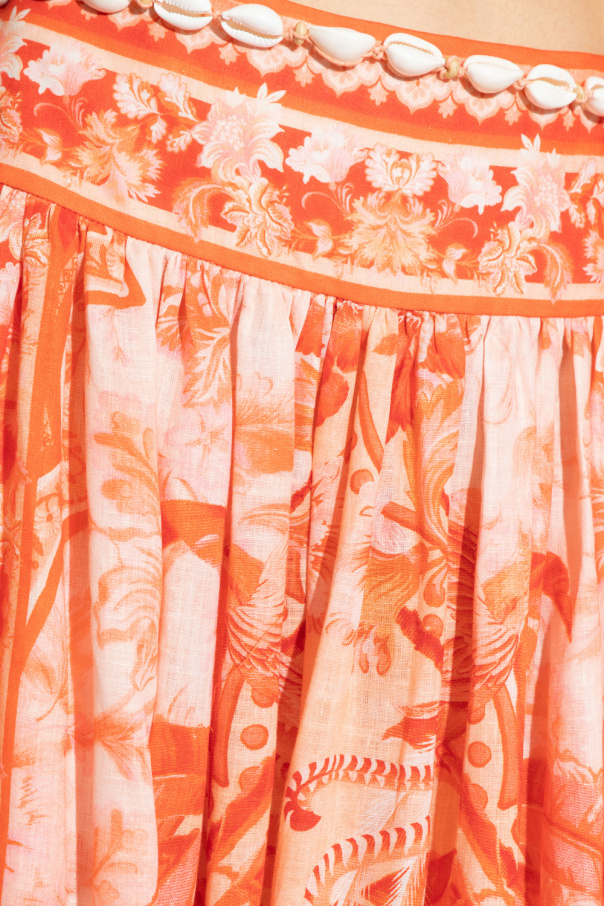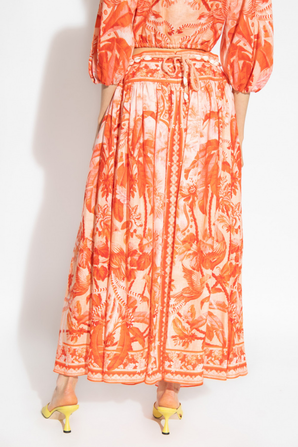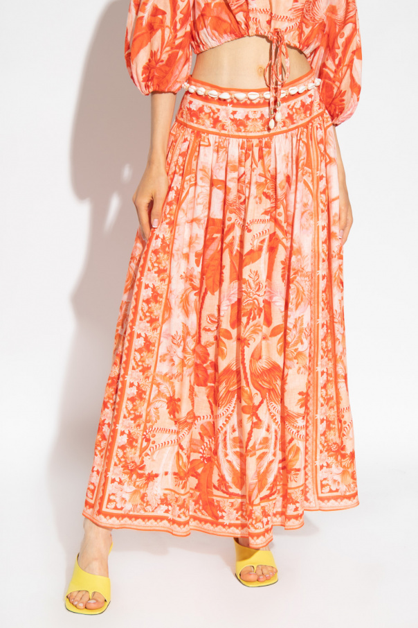Orange and red skirt from Zimmermann. Made from linen, this style showcases a colourful floral pattern. It is complete with a hidden zipper with a hook & eye closure at the back, a woven belt with shell charms that defines the waist, and a flared hem with two slip pockets.