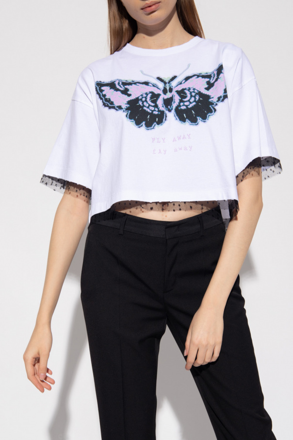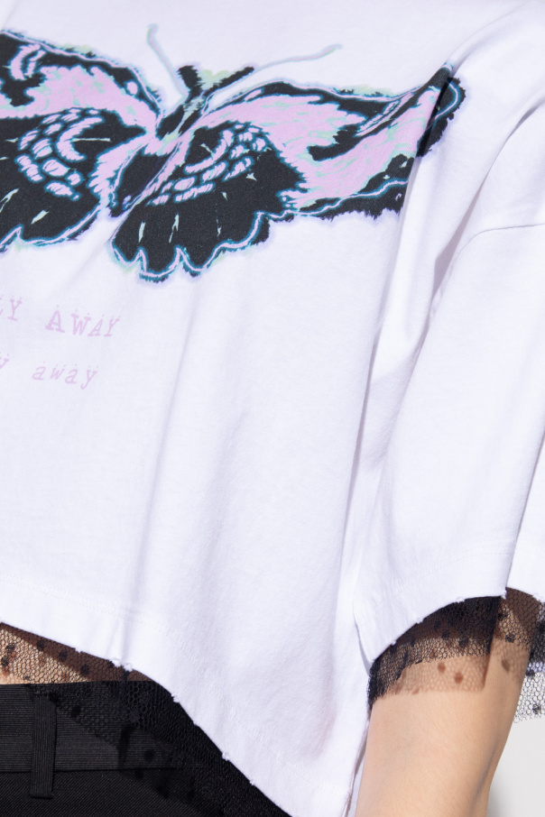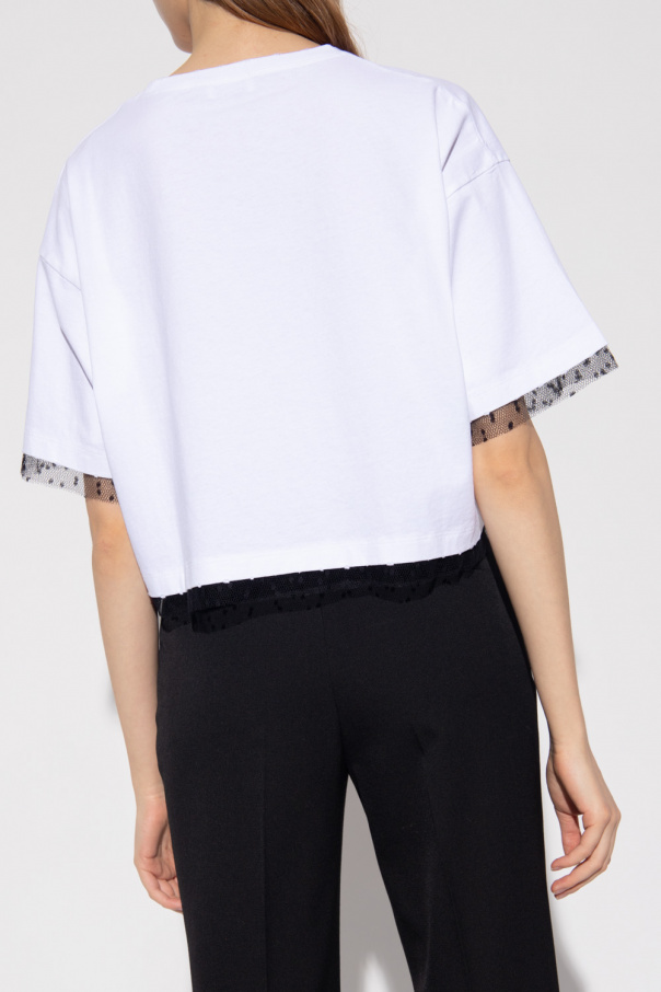 White T-shirt from Red Valentino. Crafted from cotton, this garment features a multicolored animal print, distressed round neck, short sleeves and tulle trims with a black polka dot pattern.
