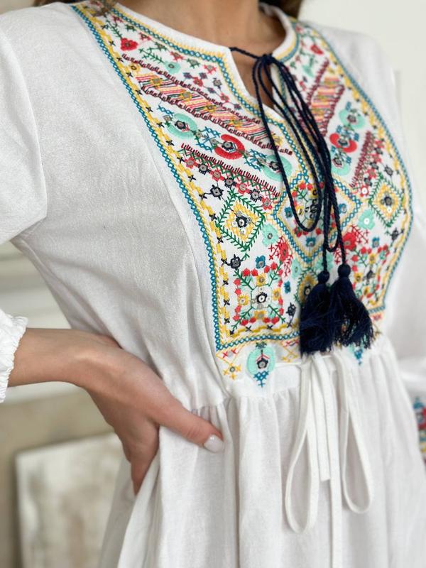 неймовірно красива й універсальна сукня прямого силуету з елегантним розрізом на грудях, пишними рукавами на гумці внизу, зручним вшитим поясом, що чудово підкреслює красу вашої фігури, і приголомшливо гарною вишивкою на грудях, сукня виготовлена зі штучного льону високої якості.