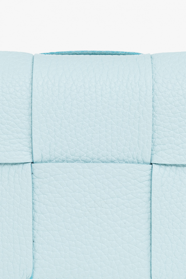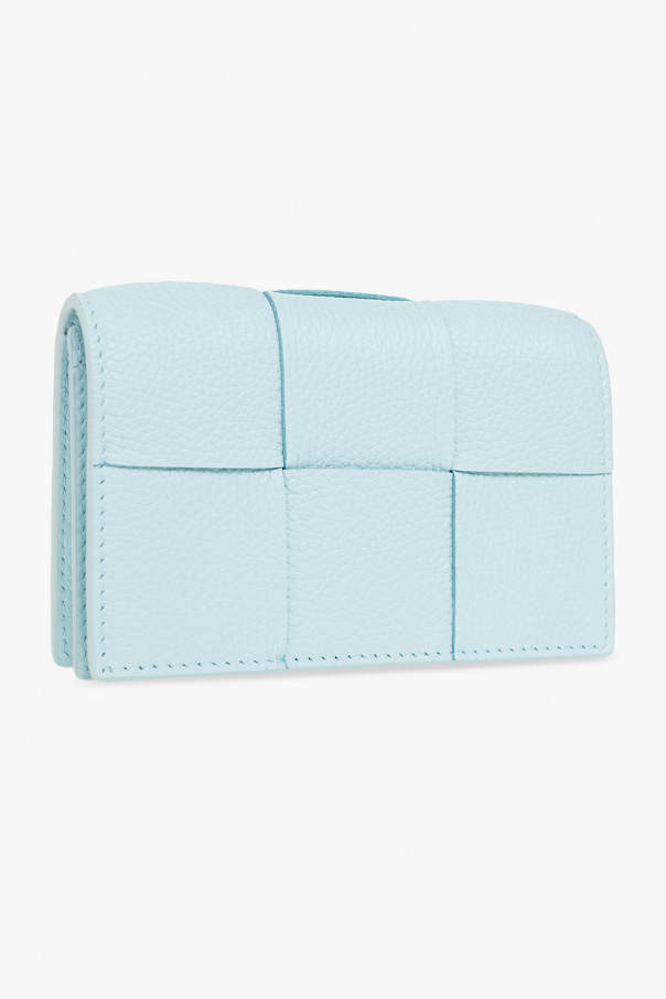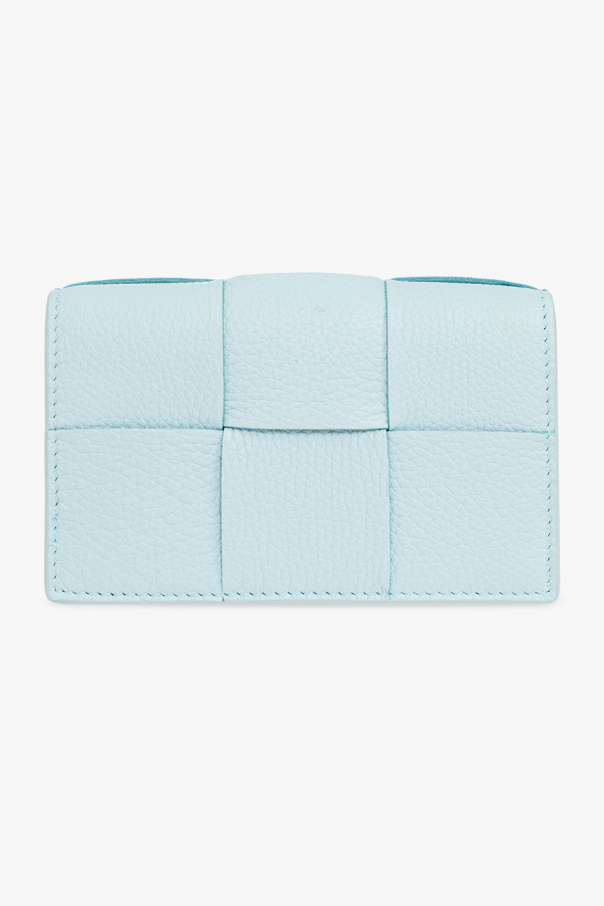 Light blue card holder from Bottega Veneta. Made of calf leather with the brand’s signature Intreccio weave, this item features a snap closure and one internal compartment with one card slot.
