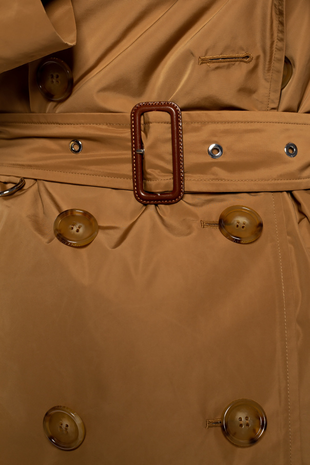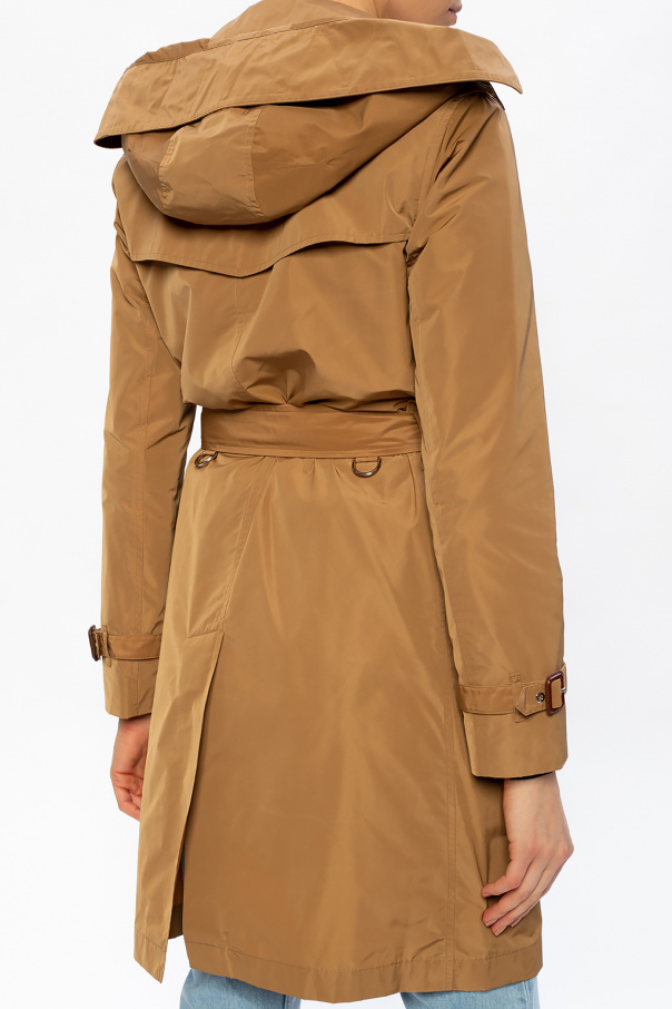 Brown double-breasted trench from Burberry. Fastened with buttons, this garment also features a buckled belt, two buttoned pockets, drawstring hood, long sleeves and a slit at the back.