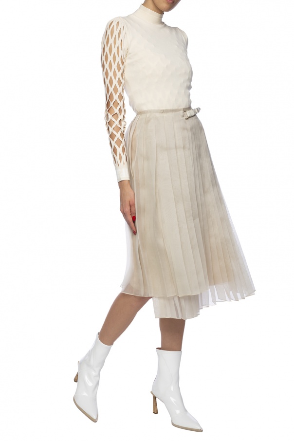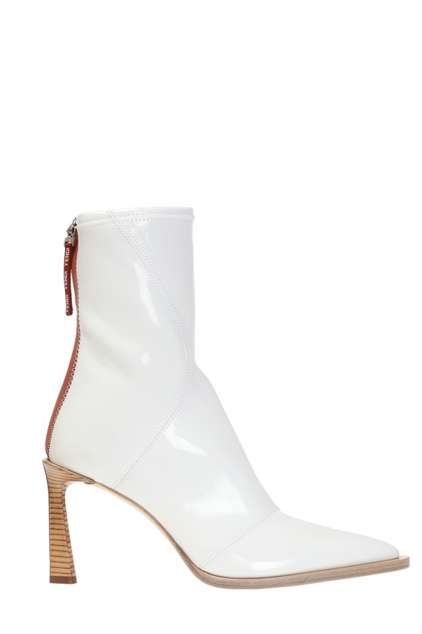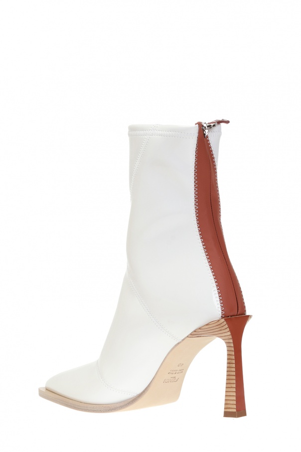 White and brown heeled ankle boots from Fendi. Made of patent faux leather. Zip fastening. Beige leather sole.