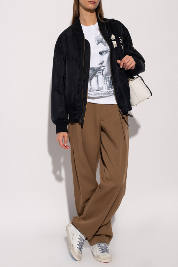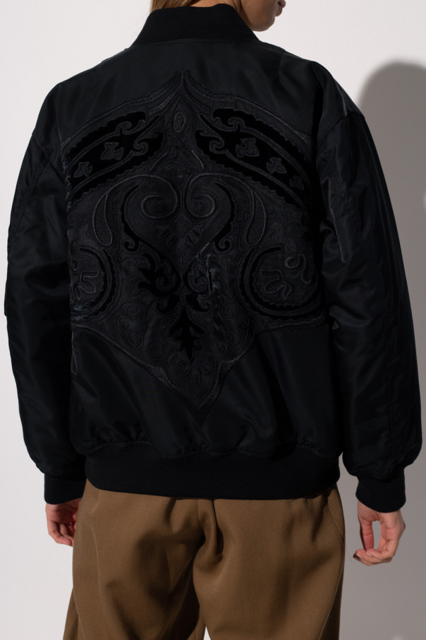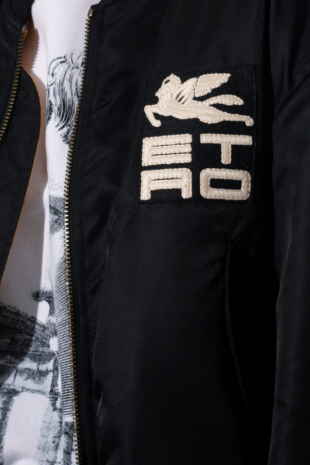 Black bomber jacket from Etro. Fastened with a zip, this garment features an embroidered logo pattern in white, two snap-fastened flap pockets and ribbed trims at the collar, hem and cuffs.
