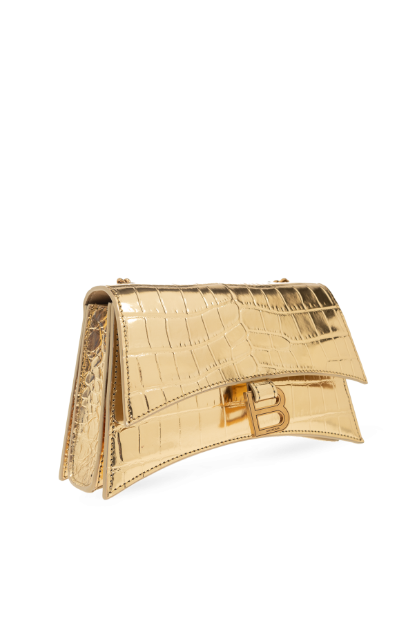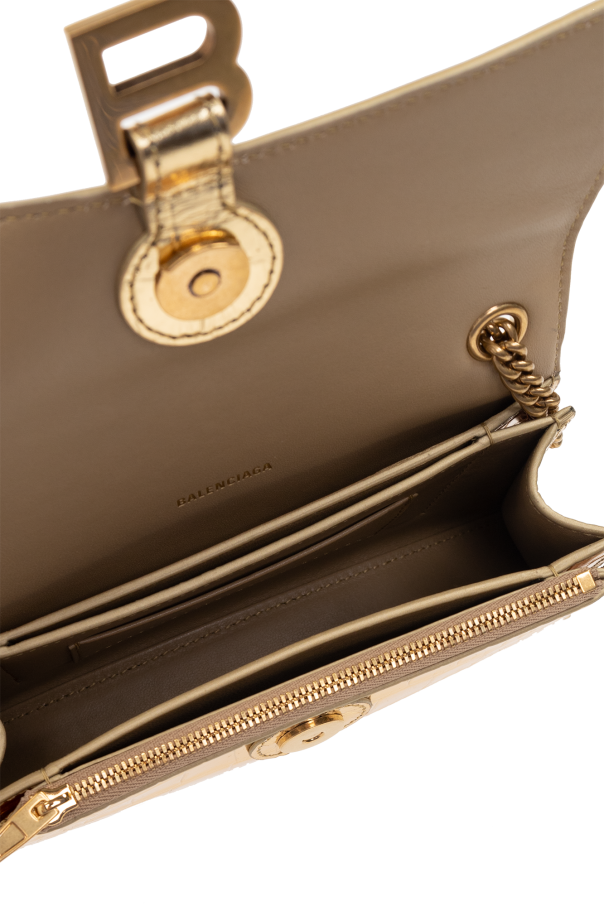 Gold-tone ‘Crush XS’ wallet from Balenciaga. Crafted from calf leather with a crocodile skin effect, this design fastens via a snap and showcases a ‘B’ charm with an engraved logo on the flap. It is complete with a chain shoulder strap, gold-tone metal hardware and one internal compartment with three slip pockets, one zip pocket and two card slots.