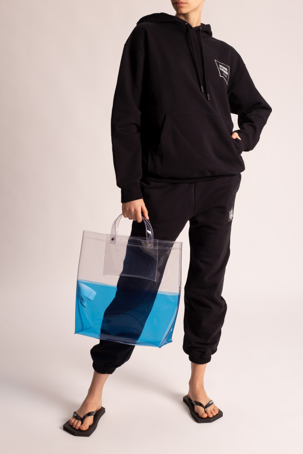 Black slides from Opening Ceremony. Printed with the brand\'s logo in white, this pair sits on a black rubber sole.