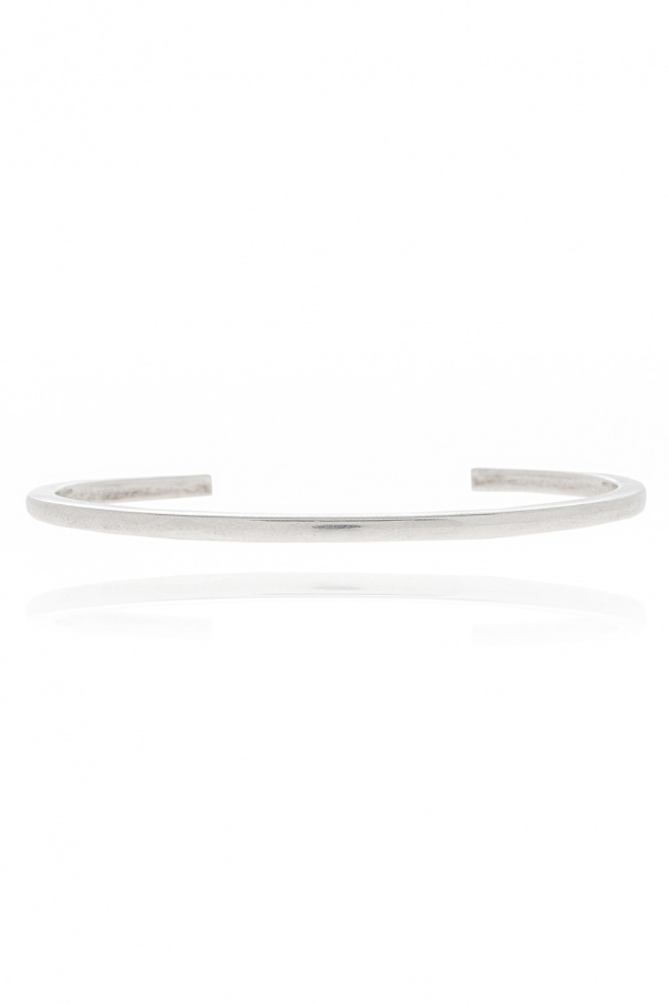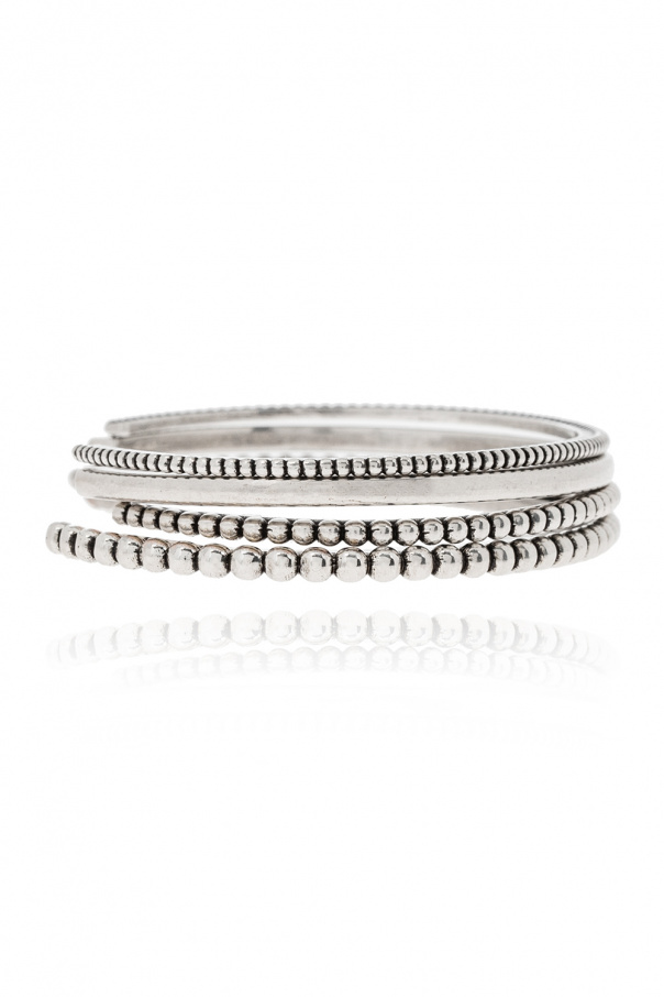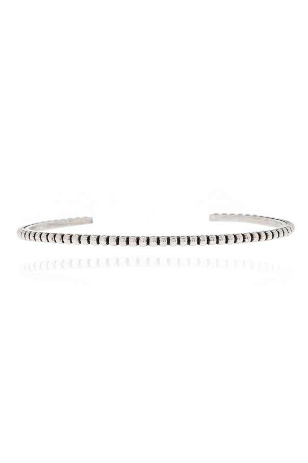 Set of four open cuff bracelets in silver-tone from Saint Laurent. Made of brass with different widths, they showcase different orb-like textures.