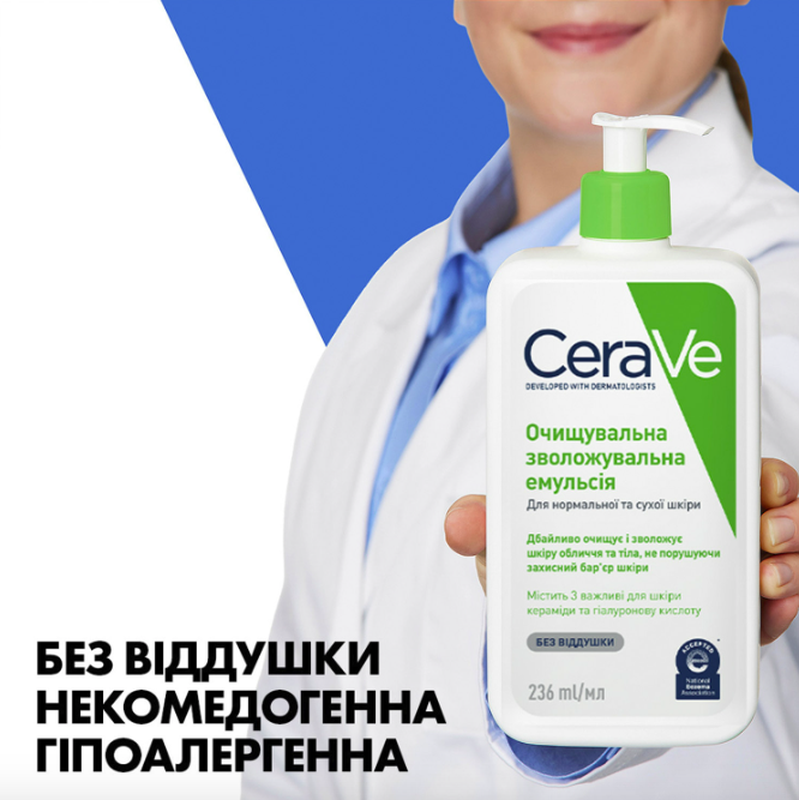 Зволожуюча емульсія для вмивання обличчя та тіла CeraVe - це косметичний засіб, розроблений у співпраці з дерматологами, призначений для догляду за нормальною та сухою шкірою. Ніжно очищає її, інтенсивно зволожує та регенерує, а також відновлює захисний бар’єр. Гіпоалергенна емульсія CeraVe також ідеально підходить для чутливої шкіри.