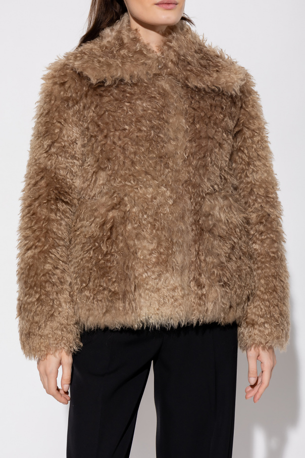 Brown ‘Lea’ jacket from Burberry. Crafted from a tactile mohair-blend faux fur, this style features a concealed double press-stud closure, an exaggerated collar, long sleeves and two slip pockets.