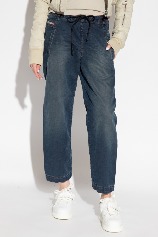Dark blue ‘D-KRAILEY’ jogger jeans from Diesel. Crafted with JoggJeans®, this pair features a relaxed silhouette, a drawstring waistband, four slip pockets and logo patches on the front and back.