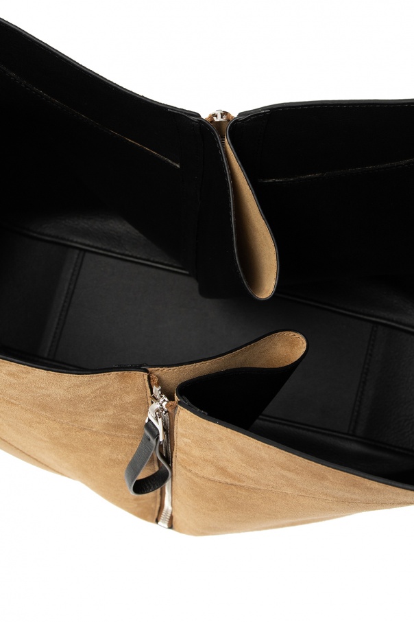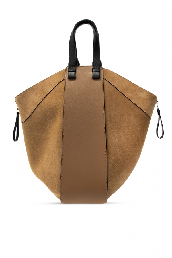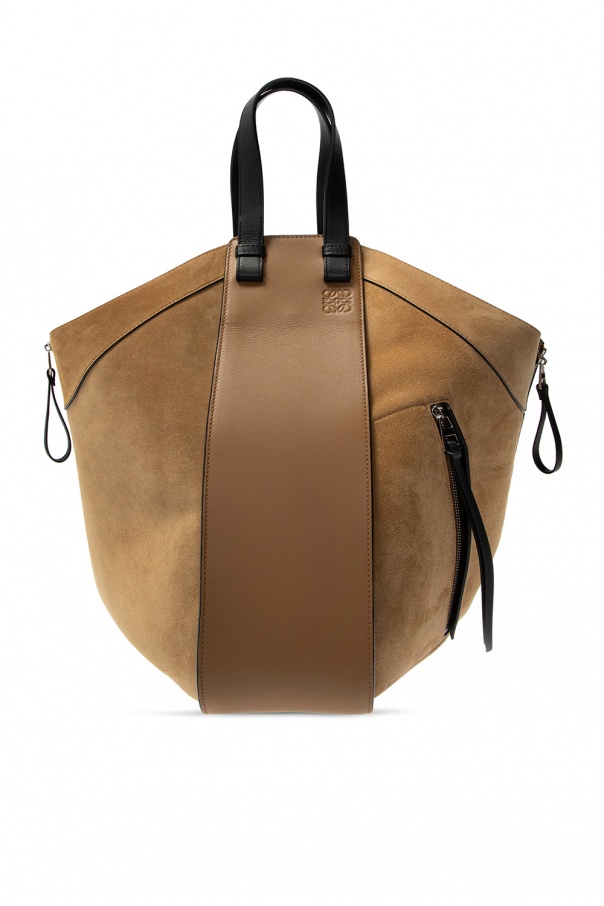 Beige ‘Hammock’ shopper bag from Loewe. Crafted from suede, this design showcases decorative silver-tone zipped vents, a zip pocket on the front, an embossed logo on the side, two half-round handles, a detachable and adjustable shoulder strap in black and one internal compartment.