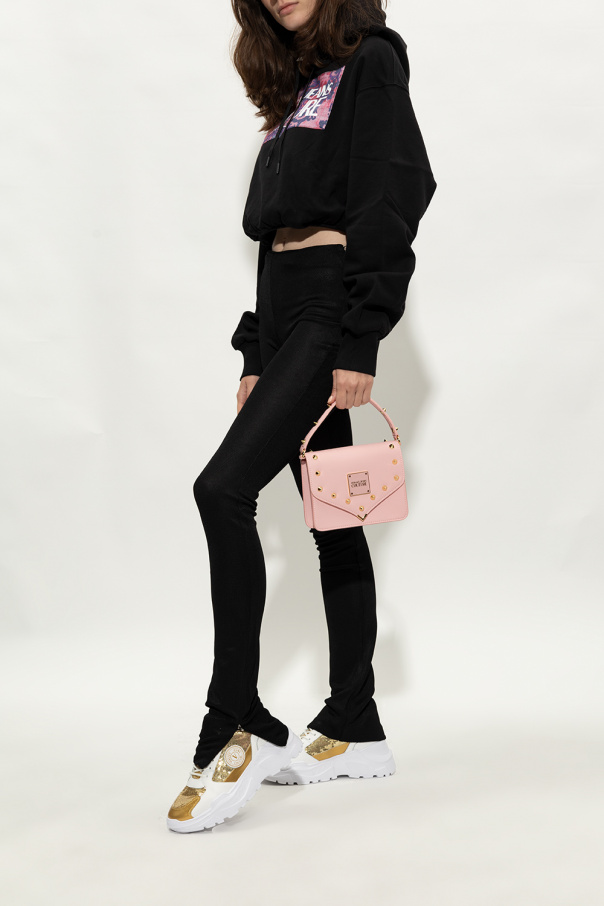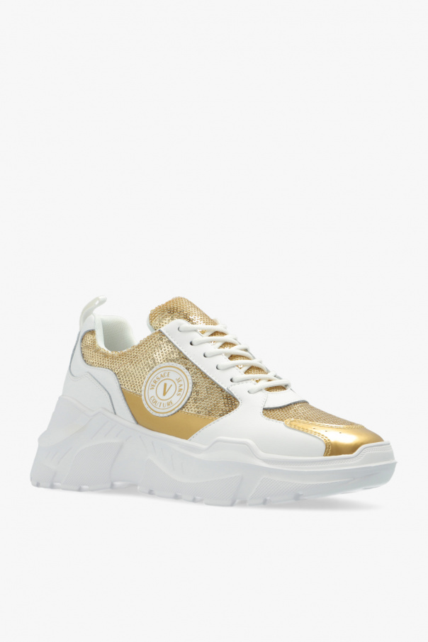 White sneakers from Versace Jeans Couture. Emblazoned with sequins and a gold-tone logo, this lace-up model features leather trims and a white rubber sole.