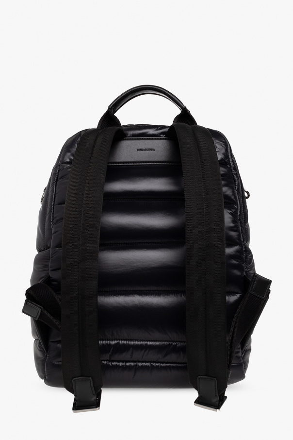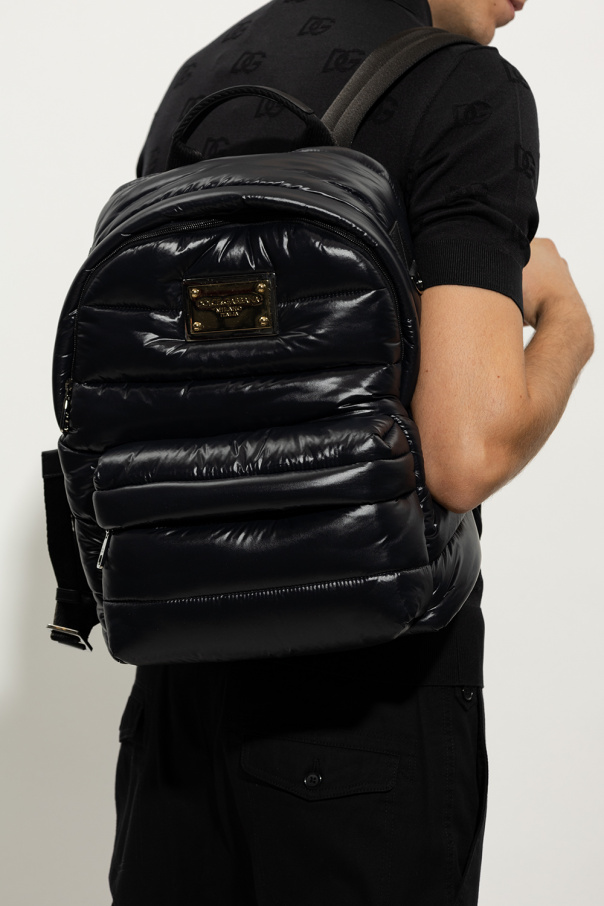 Black quilted backpack from Dolce & Gabbana. Crafted from technical fabric with a shiny finish and calf leather trims, this model is complete with a zipped front pocket, metal logo-engraved appliqué, top handle, adjustable shoulder straps, gold-tone and dark silver-tone metal hardware and one internal compartment with one slip pocket and one zip pocket.