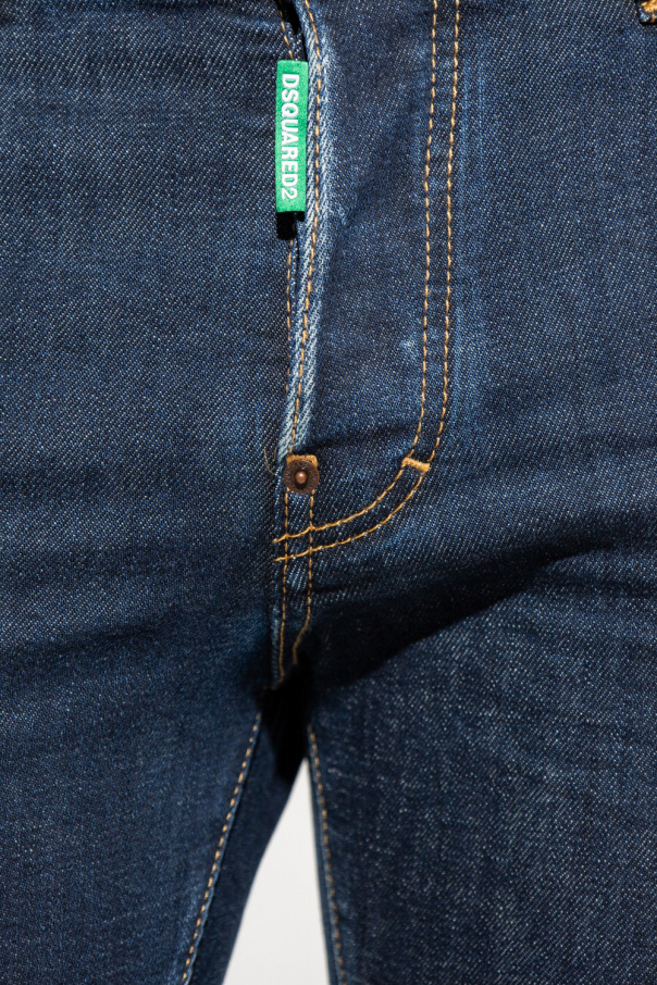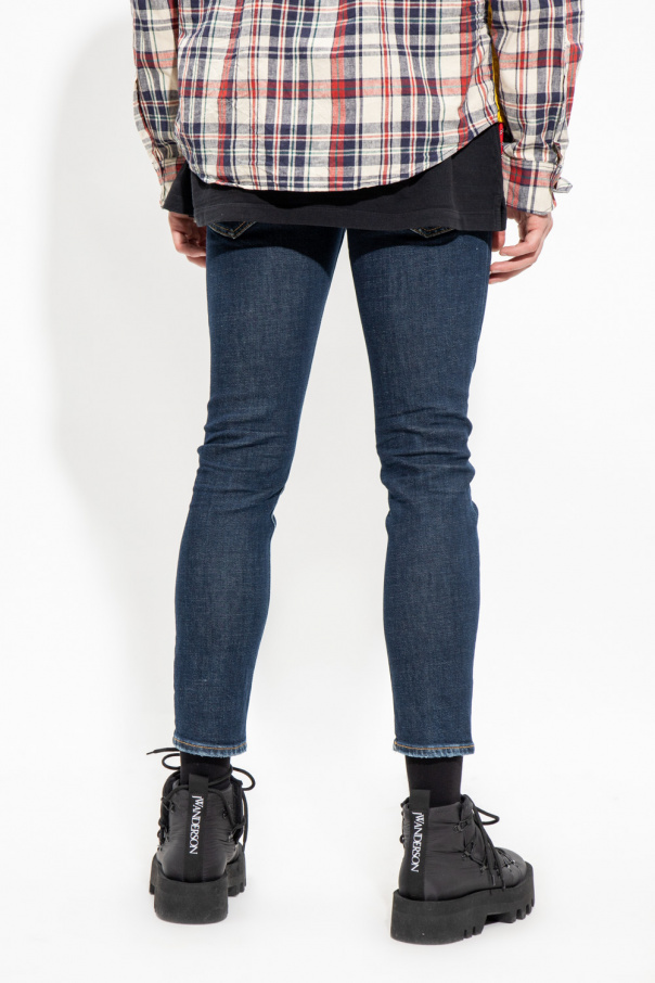 Navy blue ‘Skater’ jeans from Dsquared2, the ‘One Life One Planet’ collection. Falling with slightly tapered legs, this pair features a low-rise waist, button closures, classic five pockets, a back logo patch and distressed detailing.