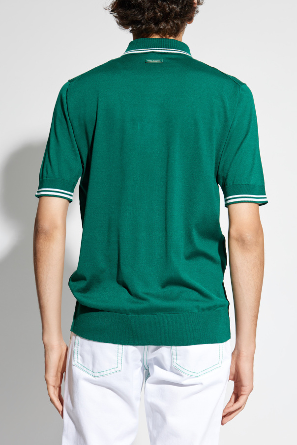 Introducing the epitome of sartorial elegance, the Dolce & Gabbana Silk Polo in a vibrant shade of green. This exquisite piece, hailing from the \'PROSTE\' collection, encapsulates a blend of casual sophistication and timeless style. Crafted from 100% silk, the fabric exudes a delicate sheen, akin to that of the finest silk, presenting a smooth, uniform texture that whispers luxury. The polo boasts an intense green hue, complemented by a classic collar adorned with a contrasting white stripe along the edge and at the sleeve cuffs. Such details infuse the piece with an air of understated elegance. The short sleeves, finished with a snug ribbed cuff featuring a white stripe, and a similar ribbed hem, ensure a perfect fit that accentuates the body\'s silhouette. The front placket, secured with sleek black buttons, adds a touch of sophistication, while the polo\'s back remains unembellished, embracing a minimalist design ethos. Notably absent are any overt branding elements, underscoring the garment\'s refined aesthetic. A close inspection of the collar and buttons reveals meticulous craftsmanship, a hallmark of the esteemed Dolce & Gabbana brand, known for its commitment to quality and attention to detail. Why Purchase This Product? Crafted from luxurious 100% silk, offering unparalleled comfort and quality. Features an elegant design with subtle, sophisticated detailing. The intense green and cream palette is both unique and versatile, suitable for various occasions. Minimalist design with no overt branding, for those who prefer elegance over logos. Emblematic of Dolce & Gabbana\'s renowned craftsmanship and design prowess.
