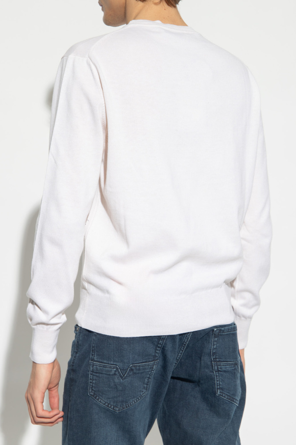 Cream crewneck sweater from Vivienne Westwood. Made of a cotton and cashmere blend, this style showcases an embroidered colourful logo pattern, long sleeves and ribbed trims on the collar, bottom hem and cuffs.