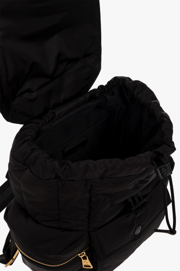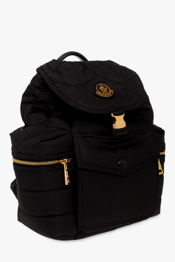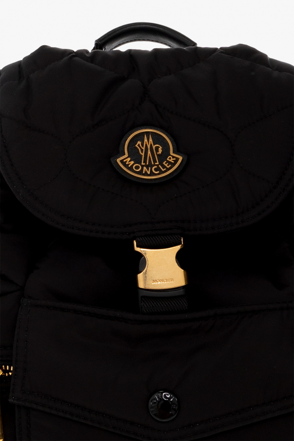 Black backpack from Moncler. Fastened with snaps, this design features a logo appliqué, two zip pockets, one snap-fastened pocket, half-round handle, adjustable shoulder strap, gold-tone metal hardware and one internal compartment with drawstrings and one slip pocket.