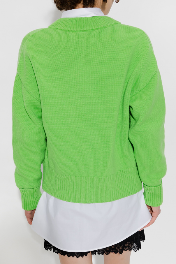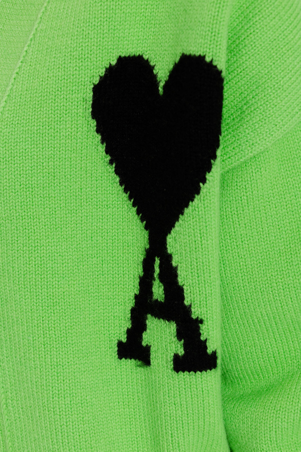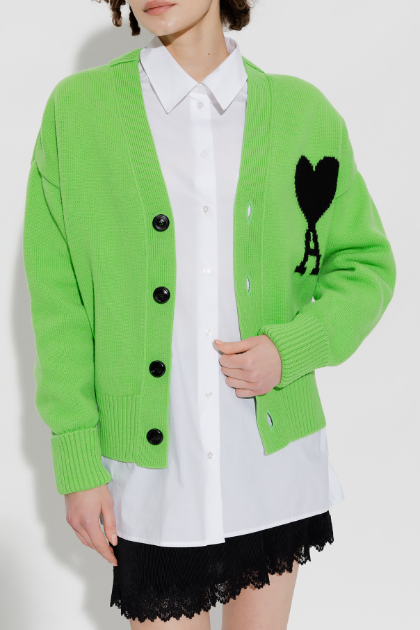 Green cardigan from Ami Alexandre Mattiussi. Made of virgin wool, this garment features button fastenings, black Ami de Coeur logo detail and ribbed trims at the V-neck, hem and cuffs.