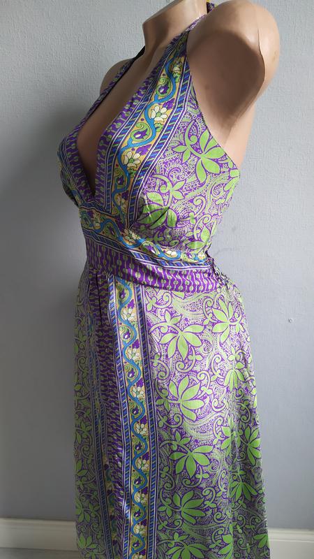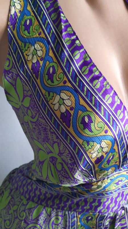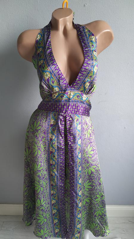 Яскравий, легкий з натурального шовку (70% шовку) гарне поєднання фарб, відкрита спина, розмір вказано приблизний, сток, див. заміри: довжина від верхньої точки чашки - 110 см, довжина по боковому шву - 90 см, під грудьми - 36 см (тягнеться за рахунок гумки до 45)