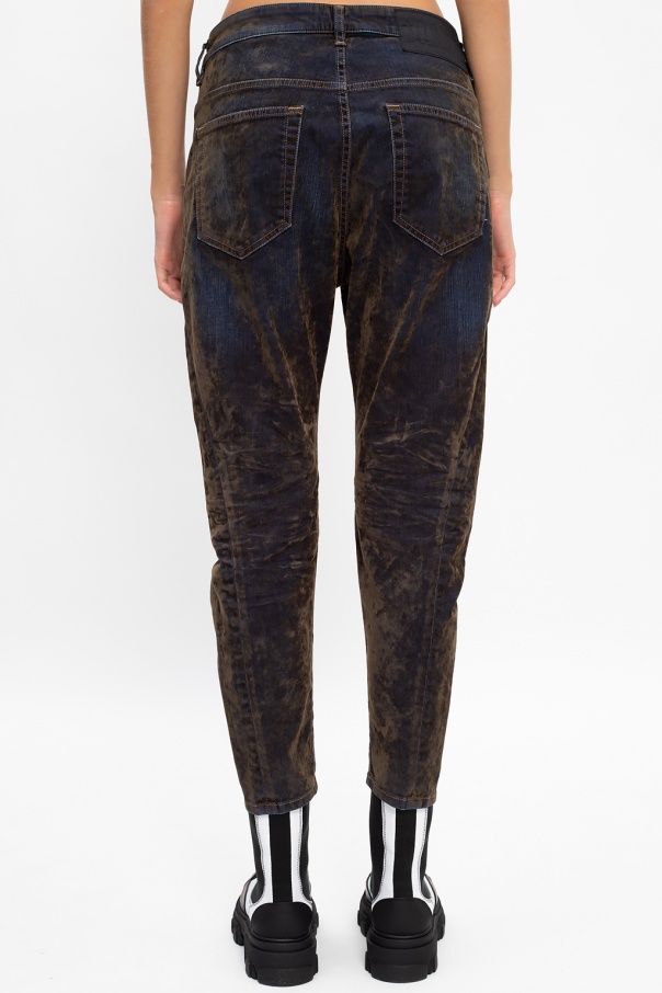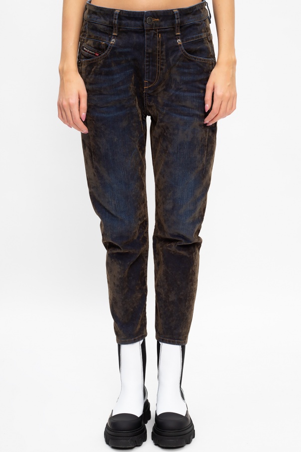Navy ‘D-Fayza’ jeans from Diesel. Fastened with a zip and buttons, this tapered leg design features a printed velour pattern in brown as well as two front and two rear pockets.