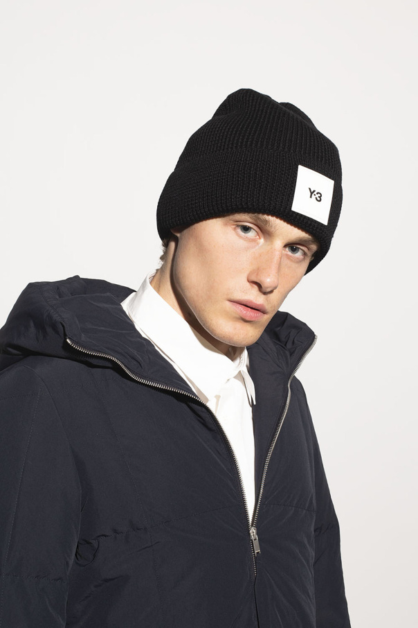 Black rib-knit hat from Y-3 Yohji Yamamoto. Made of wool, this item showcases a white and black logo patch for brand recognition.
