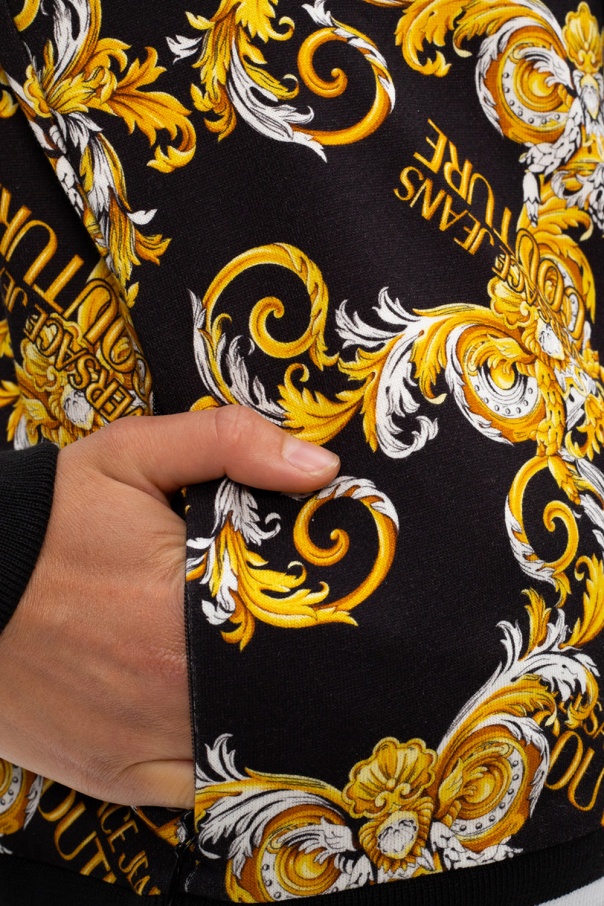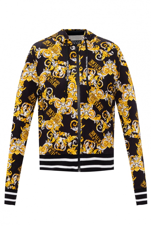 Black sweatshirt with a drawstring hood from Versace Jeans Couture. Crafted from jersey cotton, this item is embellished with printed logo of the label, stripes and its signature Barocco motif in gold-tone. It also features zip fastening, two zip side pockets and an elasticated bottom hem and cuffs.