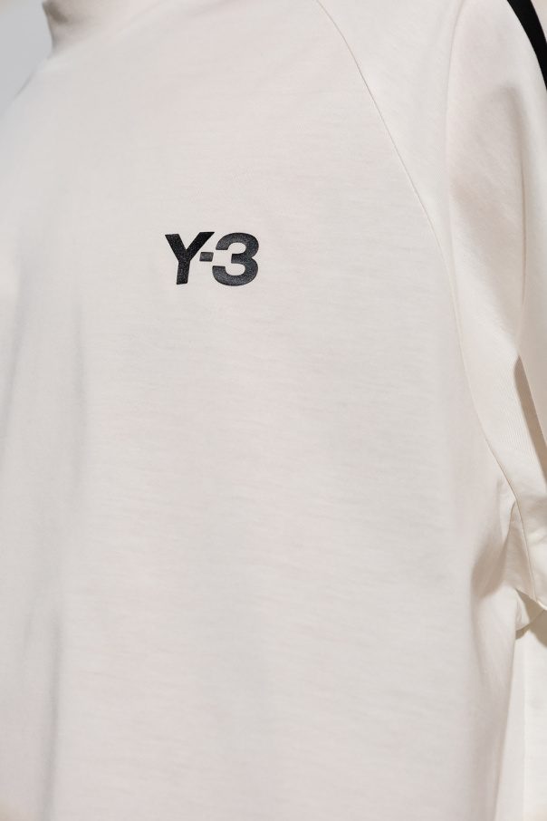 White T-shirt with a mock neck from Y-3 Yohji Yamamoto. Made from cotton with an oversize fit, this style features a printed black logo on the front, elasticized trim on the collar and long sleeves and the brand\'s signature three black stripes applied on the shoulders.