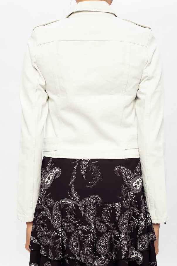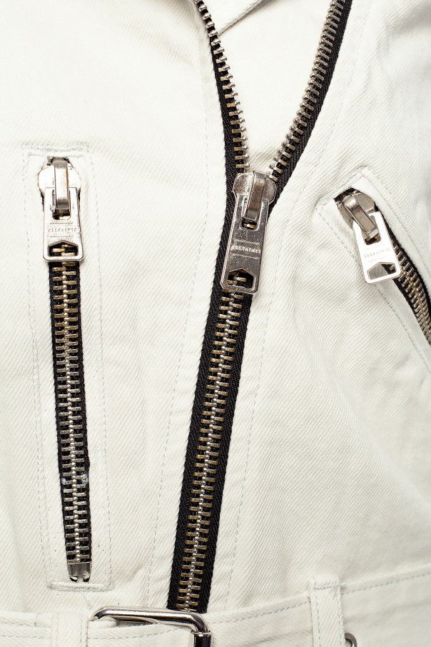 White ‘Balfern’ denim jacket from AllSaints. Fastened with a two-way zip, this item features a buckle belt at the waist, two front zip pockets and epaulettes on the shoulders.