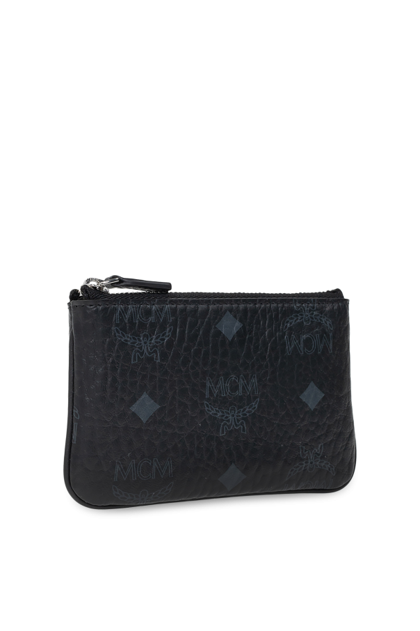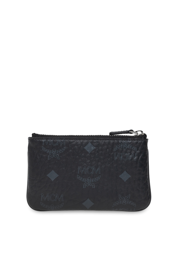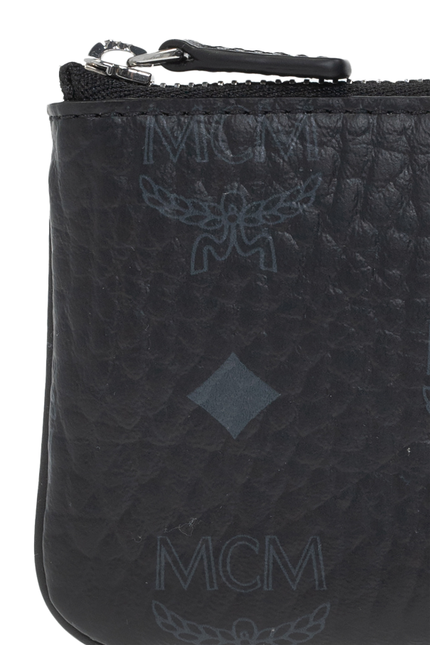 Black key holder from MCM. Made of faux leather with the Visetos motif in dark grey, this item features a zip fastening as well as a detachable clip with a chain and one card slot inside.