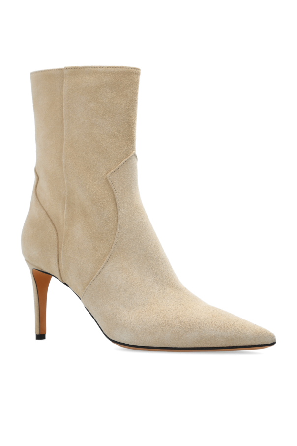 Cream ‘Davy’ heeled ankle boots from Iro. Made of suede. Fastened with a side zip, this pair features a pointed toe and brown leather sole.