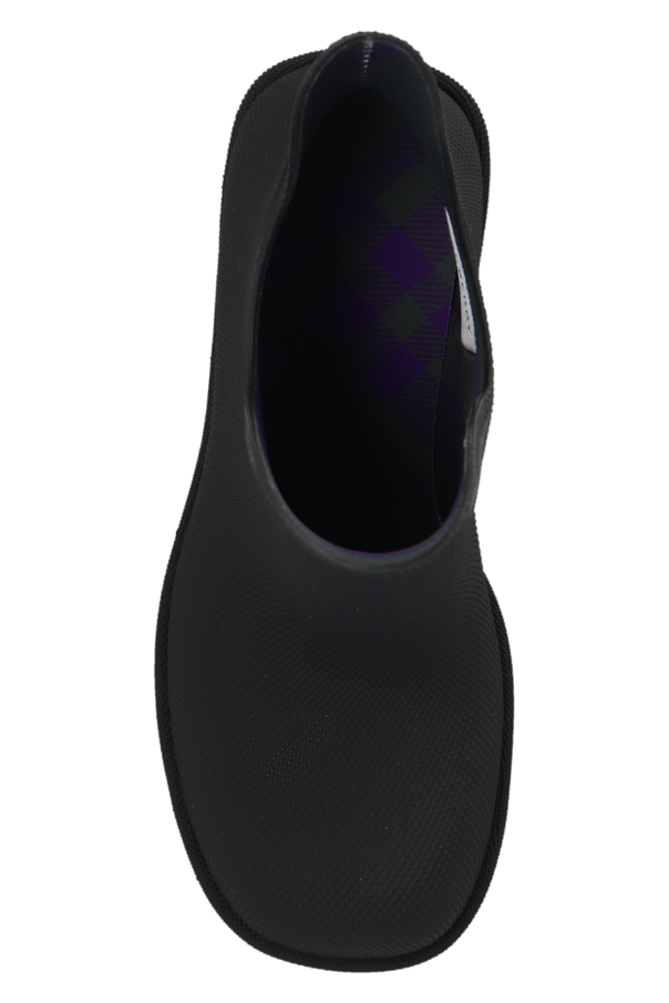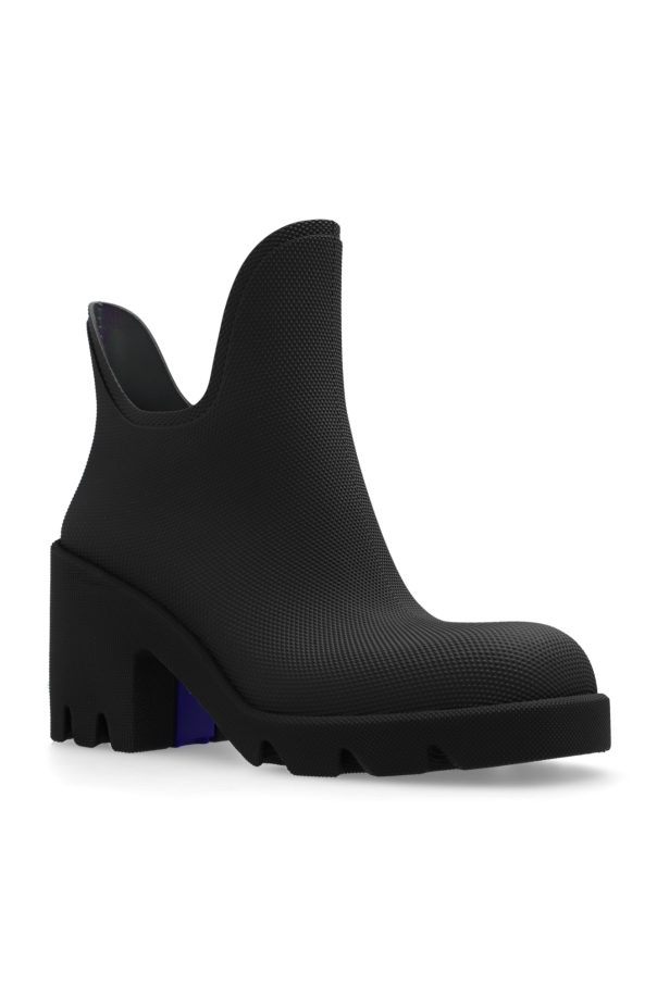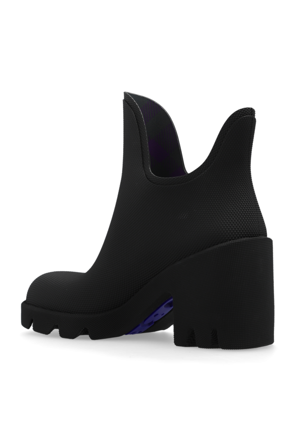 Black ‘Marsh’ heeled rain boots from Burberry. Made of textured rubber, this model sits on a black rubber sole with a logo detail and showcases the brand\'s signature check motif on the lining.