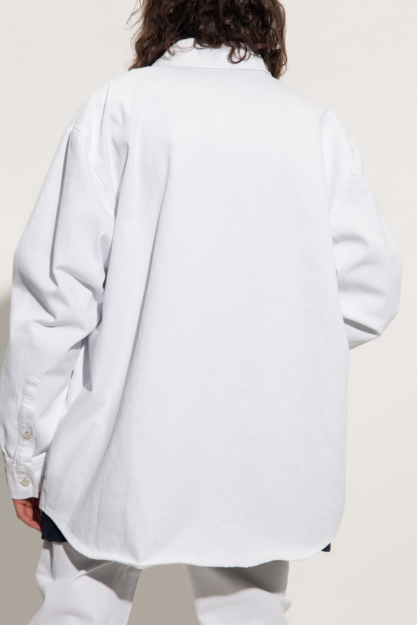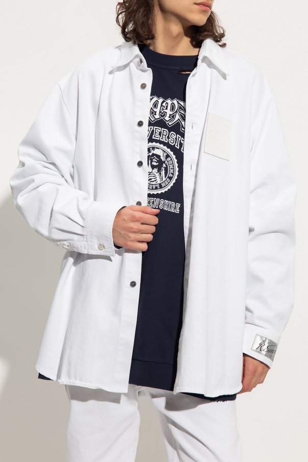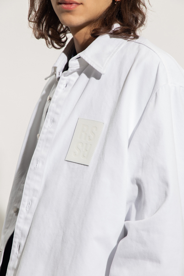 White shirt from Raf Simons. Made of cotton, this style features button fastenings, a logo-embossed patch on the front, and long sleeves with button cuffs – one has a logo patch.