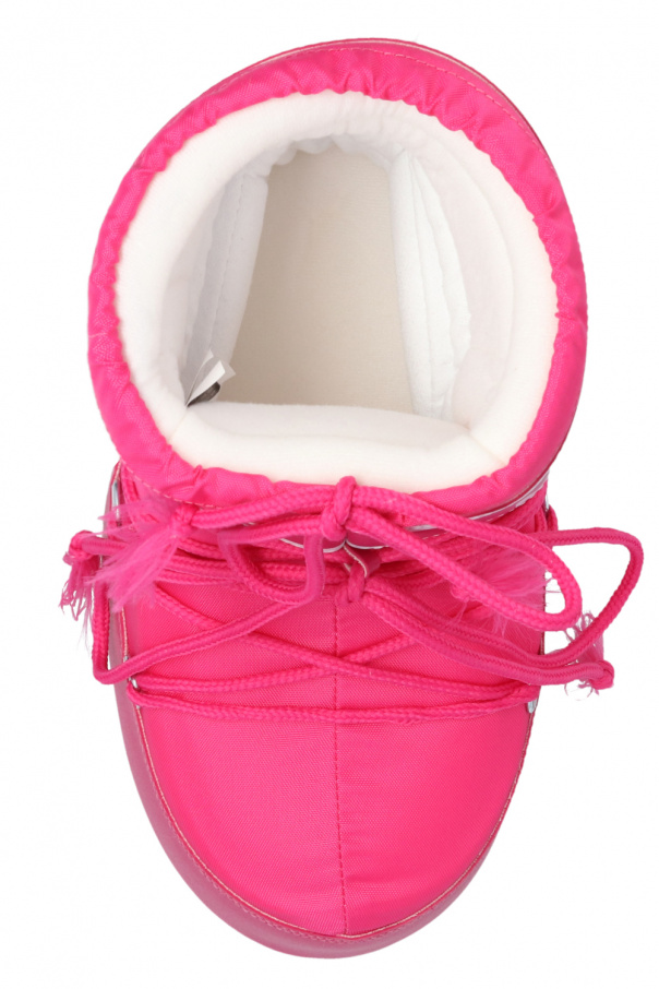 Pink and white ‘Classic Low 2’ snow boots from Moon Boot Kids. Trimmed with faux leather, this lace-up pair features a logo print, silver-tone metal hardware and rubber sole in cream and black. Inspired by the peculiar shape and technology of the astronauts’ boots, the iconic style was designed in 1969 after the first Moon landing.
