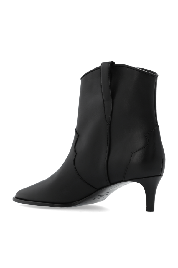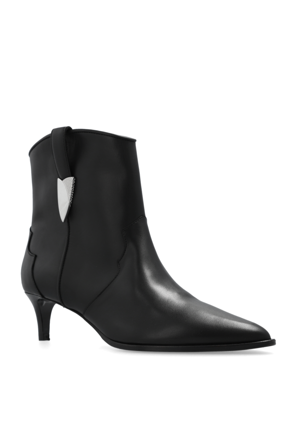 Black ‘Opale’ heeled ankle boots from Iro. Made from leather with a slip-on silhouette, this model sits on a black leather sole and features a pointed toe and silver-tone hardware embellishments.