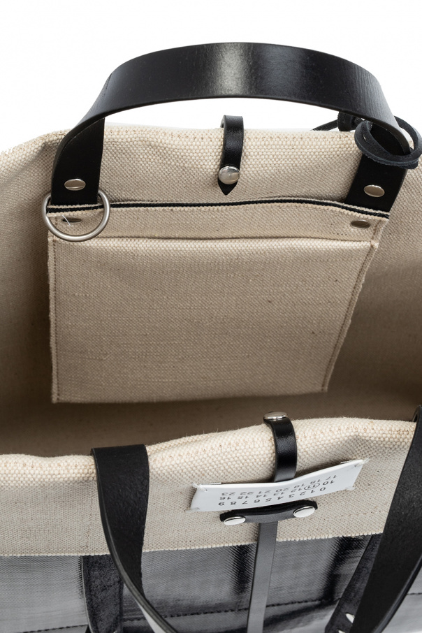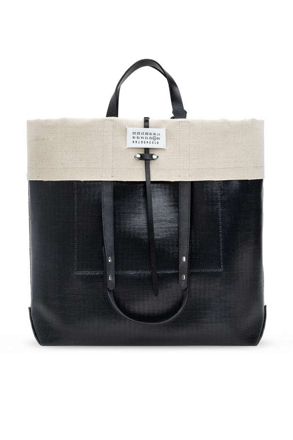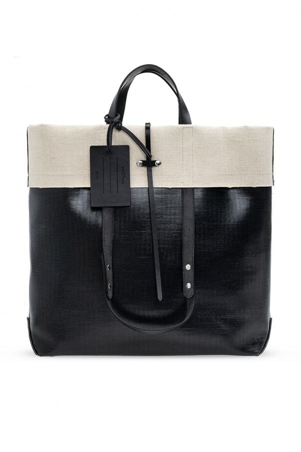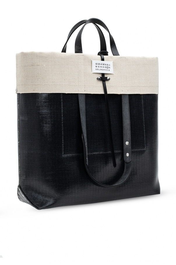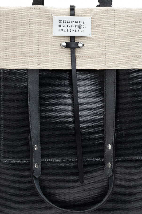 Black and beige shopper bag from Maison Margiela. Emblazoned with a beige logo patch and straps, this design features four half-round handles and one internal compartment with two slip pockets.