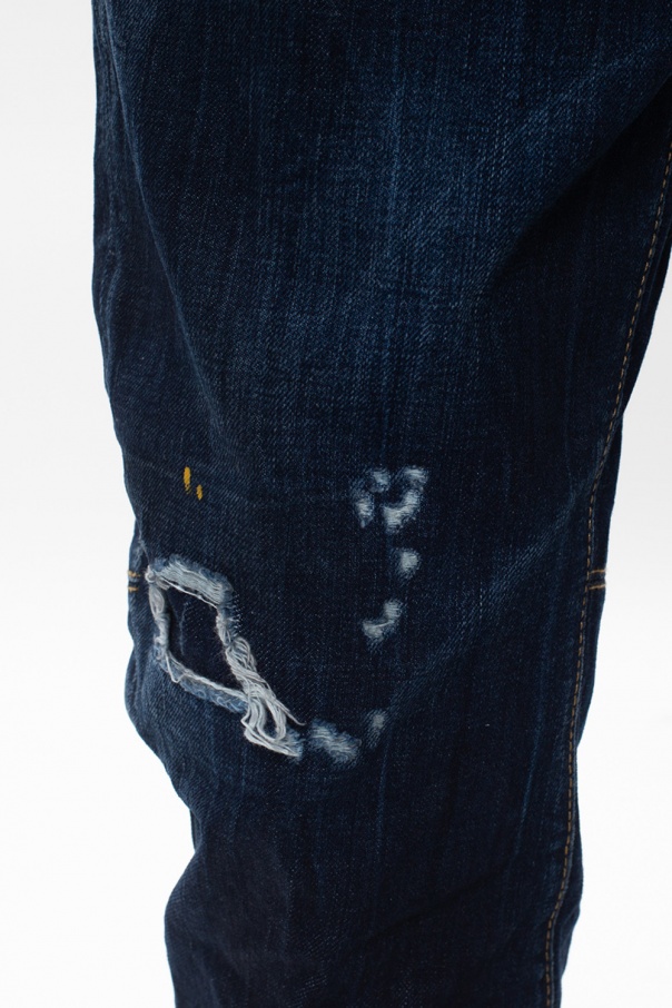 Navy blue 'Sailor' jeans from Dsquared2. Boosted with logo patches, exposed yellow stitching details and the brand's iconic colourful paint splatters, this pair is complete with button closing, classic five pockets and turn-up cuffs.