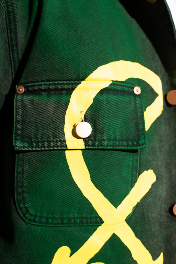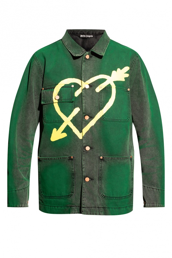 Green denim jacket from Palm Angels. Fastened with buttons, this long-sleeved design features a yellow logo print, three slip pockets and a buttoned flap pocket.