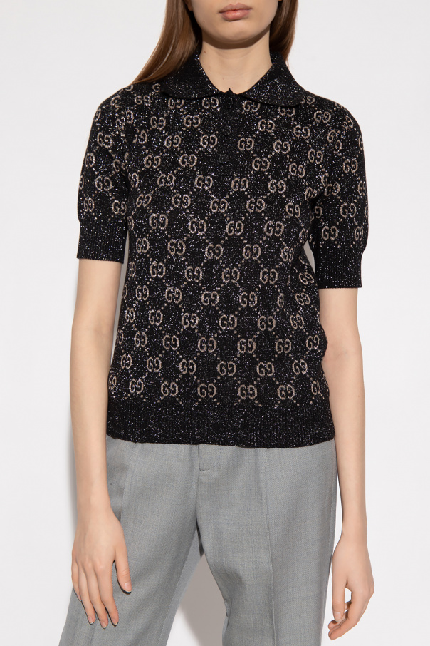 Black polo shirt from Gucci. Crafted from a cotton blend with a touch of shimmering lurex yarn, this style showcases a beige ‘GG’ monogram motif, a button placket, short sleeves and elasticized edges.