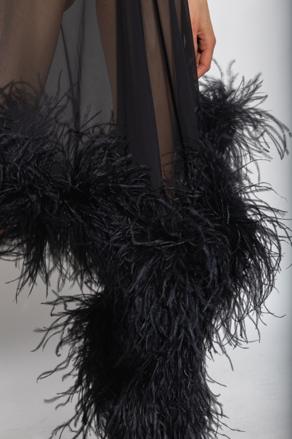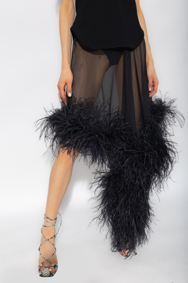 Black ‘Mya’ skirt from The Attico. Crafted in transparent material, this style fastens with buttons and features internal briefs and an asymmetrical hem accentuated with ostrich feathers.