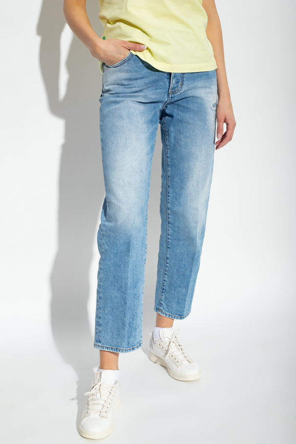 Blue ‘Boston’ jeans from Dsquared2, the ‘One Life One Planet’ collection. Crafted from cotton, this pair falls with slightly tapered legs and features button fastenings, classic five pockets and a yellow, purple and green logo patch at the back.