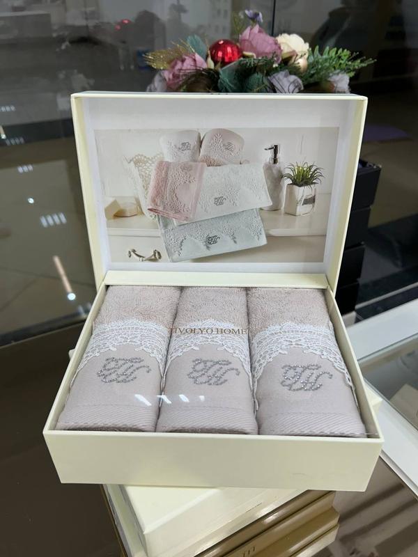 Набор состоит из трех салфеток размера 30x50 см. Салфетки имеют красивый бортик с цветочным принтом и украшены стразами с фирменной символикой TH.