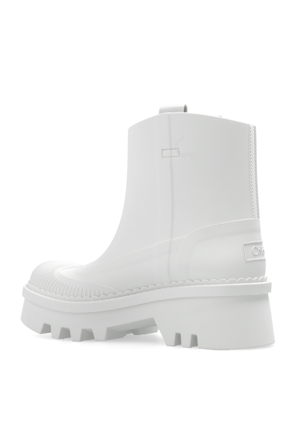White ‘Raina’ rain boots from Chloe. Set on a white rubber sole, this pair is decorated with a tactile logo at the back.